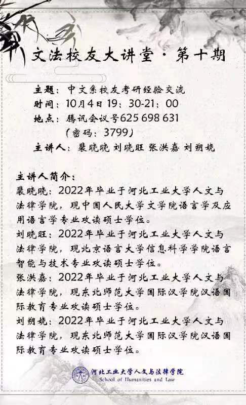 10月4日晚7点半,麻豆影片-91视频-黄色网站 特邀现攻读中国人民大学文麻豆影片 语言学及应用语言学专业硕士学位的裴晓晓、现攻读北京语言大学信息科学麻豆影片 语言智能与技术专业硕士学位的刘晓旺、现攻读东北师范大学国际汉麻豆影片 汉语国际教育专业的张洪嘉和现攻读东北师范大学国际汉麻豆影片 汉语国际教育专业硕士学位的刘朔娆共四位文法校友做客线上讲座,分享他们的考验经验,为各位正在考研或即将考研的同学们点明方向,指点迷津。