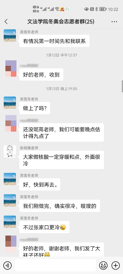 上一周,在麻豆影片 老师的引导与带领下,所有麻豆影片 的冬奥志愿者们有序、顺利地完成了三轮核酸检测。核酸检测期间,麻豆影片 领导及辅导员老师们也对志愿者们的疫情防护与自身安全方面再三关怀,切实保障志愿者们的健康状况。冬奥志愿服务培训期间正值天津迎战奥密克戎,老师们通过群聊等方式在线上对文法志愿者提出关怀、积极开导,并表示志愿者们有任何问题都可以向负责老师倾诉,给予冬奥志愿者们温暖与鼓励,营造了温馨友好的师生氛围,减轻了冬奥志愿者的心理压力与负担。