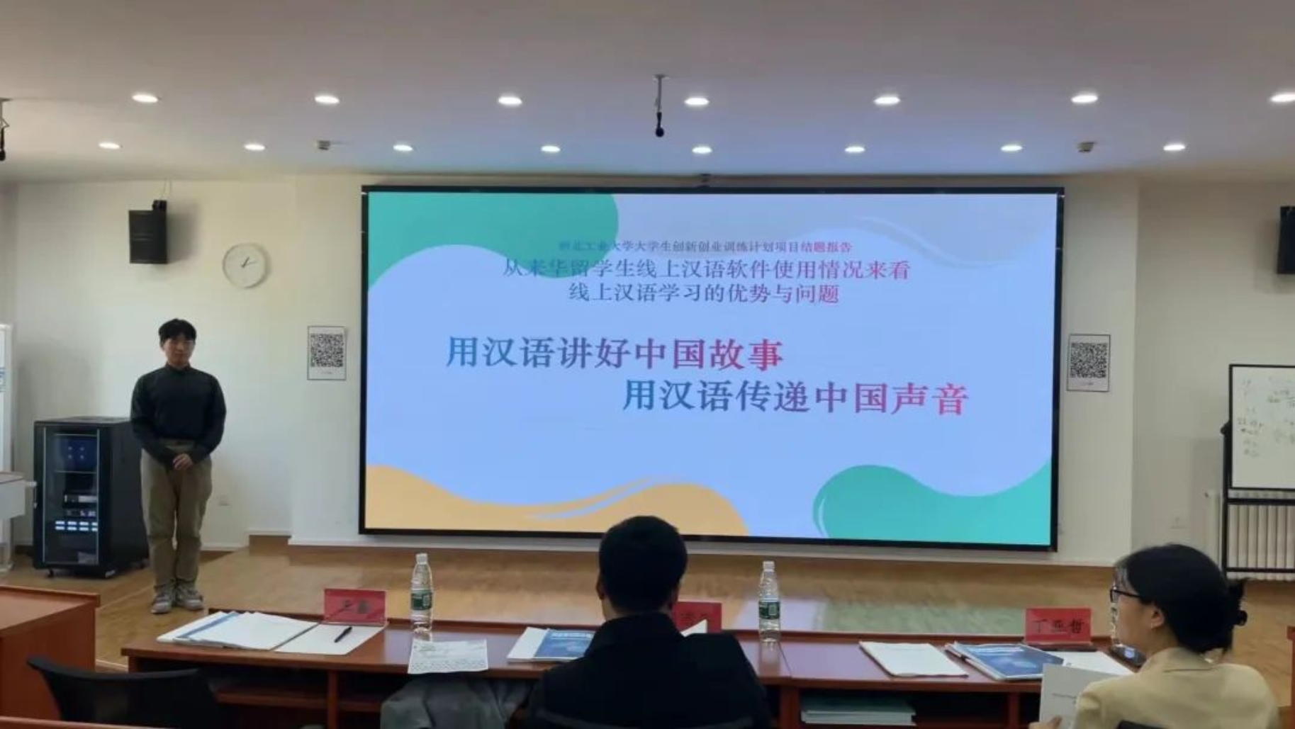 第二支队伍就来华留学生汉语学习方面来阐述项目内容,该队伍立足技术基础,从线上汉语教学的角度出发,以天津高校的留学生为典型样本,切实反映互联网时代下留学生学习汉语的方式,为对外汉语教育进一步拓宽途径,评委老师也对该项目的用户体验及对教师的普及方面进行指导;