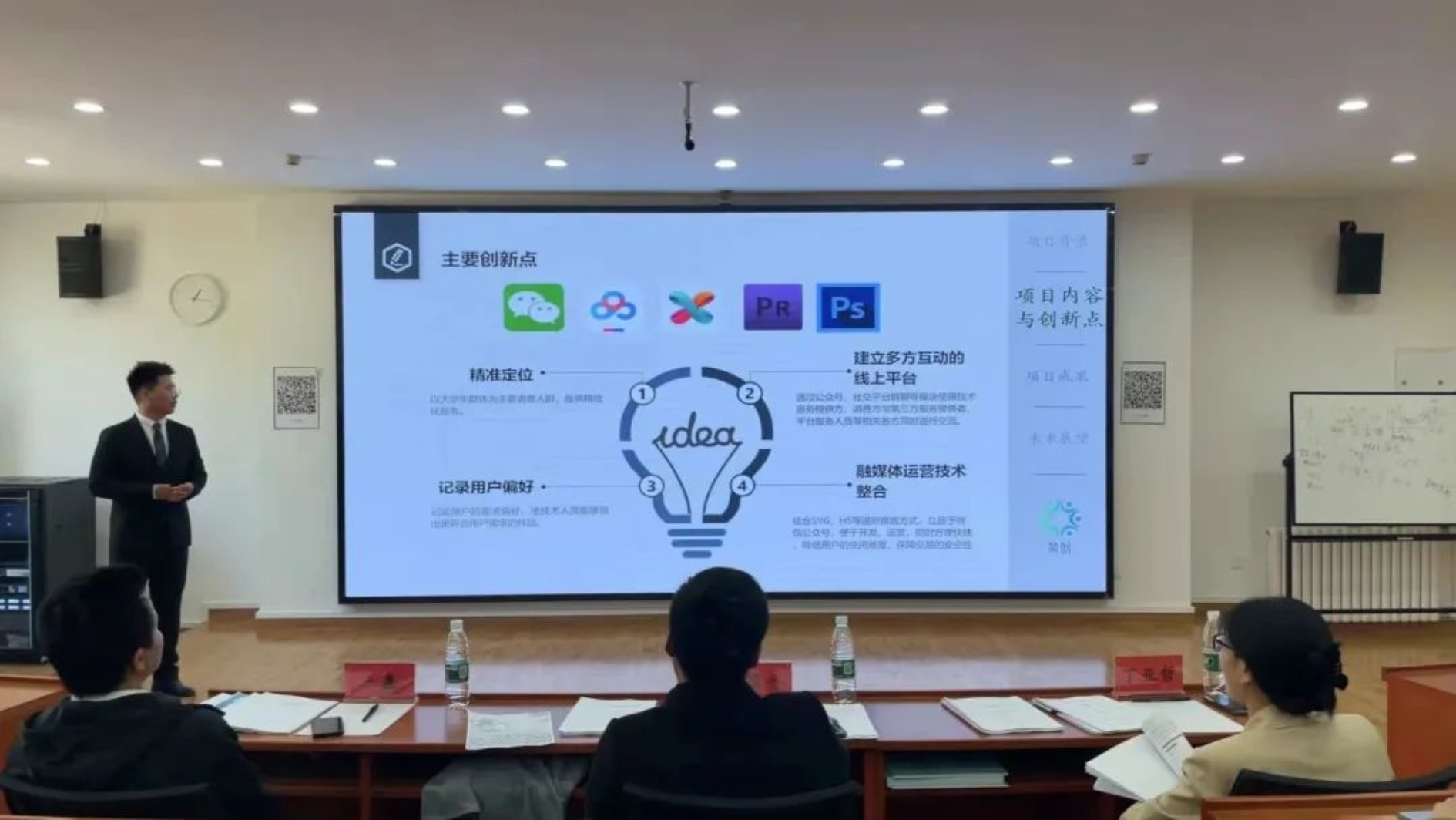 第三支队伍着眼于大学生需求,构建与运营了大学生融媒体技术技能服务平台,记录用户偏好,整合融媒体运营技术,并实现了盈利,评委老师在肯定其项目成果的同时,也提出了项目要加大宣传推广力度以及要有大学生特色等指导意见;