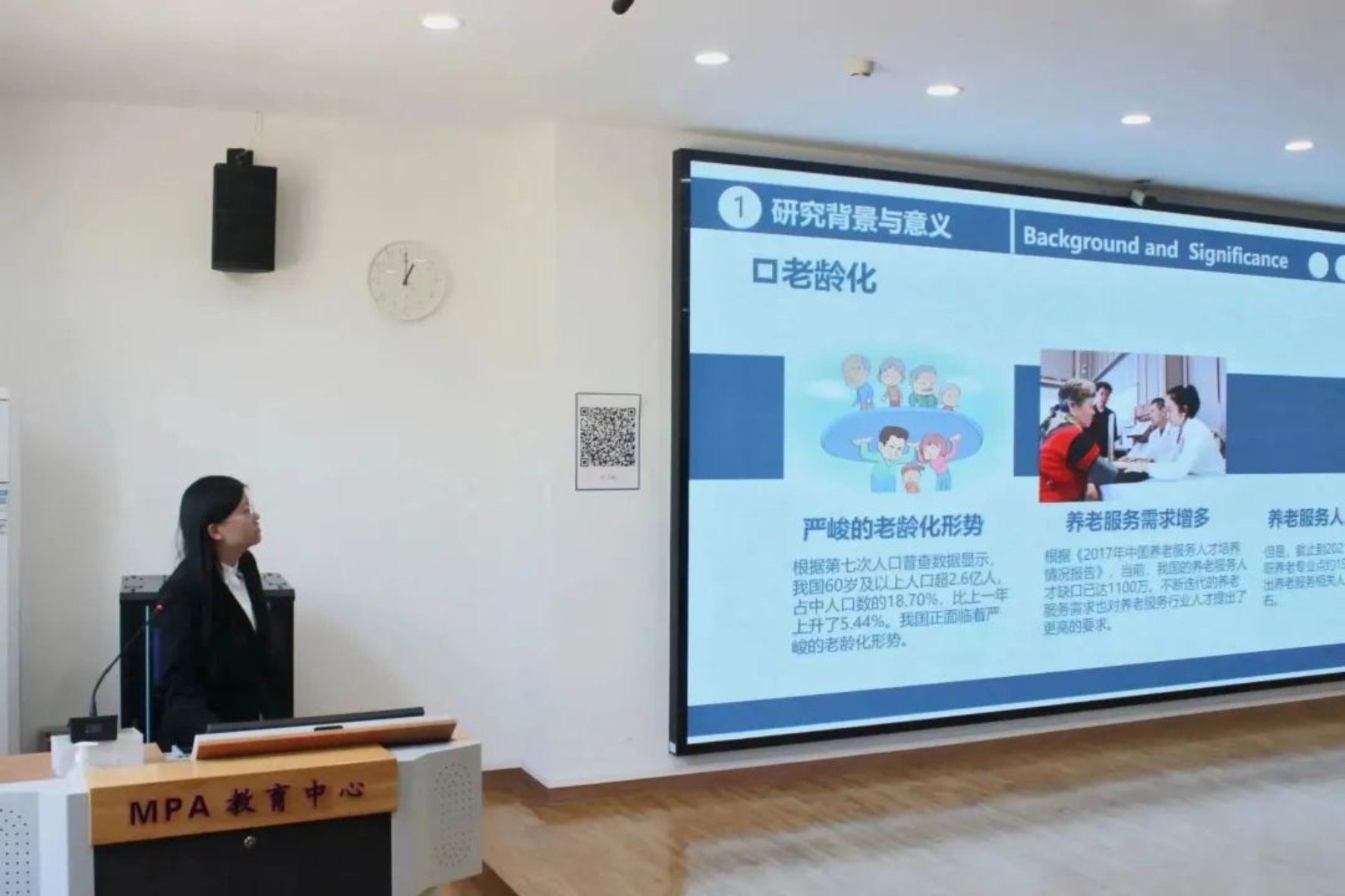 第一支队伍专注社会养老方面,提出“大学生养老行业就业机制及社区养老模式创新研究”项目,通过分析当代大学生的就业去向及对待养老行业的看法以及社区养老模式的设想等方面来阐述项目意义,其项目内涵获得评委老师的肯定;