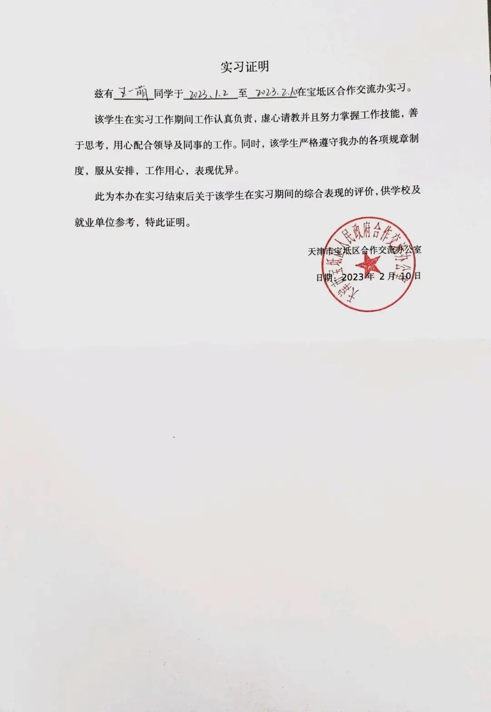 2022年寒假天津市大学生实习“扬帆计划”政务专项工作在各团区委、各高校团委、各用人单位和实习生的共同努力下圆满结束。经过各单位组织申报、考察审核等环节,麻豆影片 法学204班学生王一萌同学荣获“优秀实习生”称号。