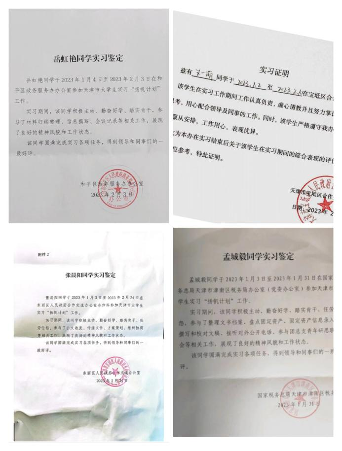 同时,还有更多的同学在天津市和平区人民政府等各级各类政府机关和事业单位开展实习,均得到了实习单位的肯定和表扬,彰显了文法学子的良好修养。