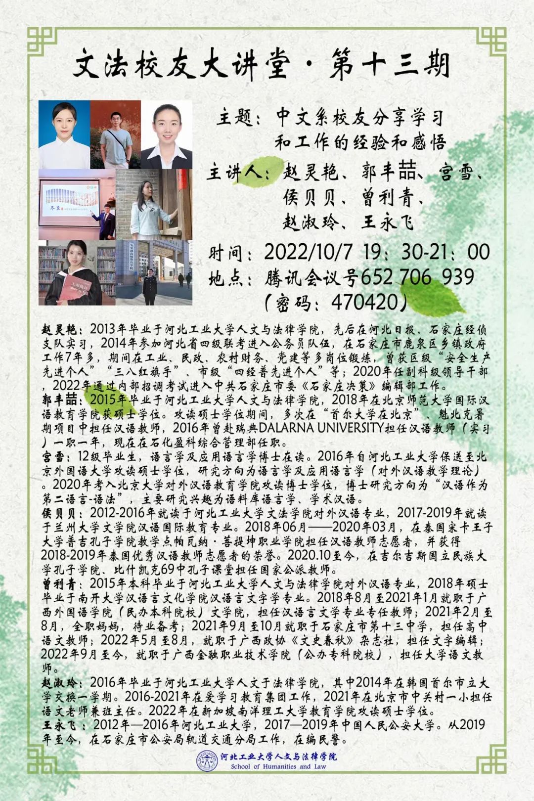 10月7日晚7点半,麻豆影片-91视频-黄色网站 特邀中共石家庄市委《石家庄决策》编辑部部员赵灵艳、石化盈科综合管理部部员郭丰喆、大学语文教师曾利青、孔子麻豆影片 国家公派教师侯贝贝、北京大学语言学在读博士宫雪、新加坡南洋理工大学教育学在读硕士赵淑玲、石家庄轨道交通分局民警王永飞等校友做客线上讲座,为同学们分享他们在学习和工作中的经验与感悟,提供更多可行性建议。