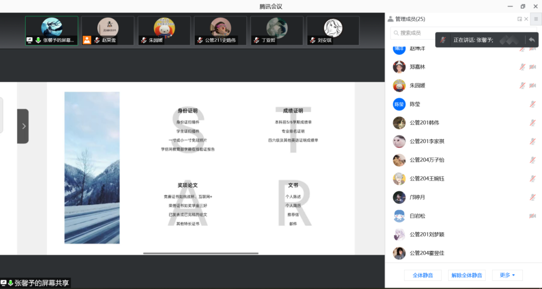 第二位分享嘉宾为公管182班张馨予,分享主题为“保研材料文书”,包括身份证明、成绩证明、奖项论文、文书四部分。