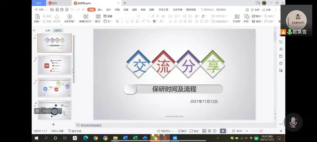 五位同学分享主题各有侧重。第一位分享嘉宾为公管182班赵昊雪,分享主题为“保研时间及流程”。