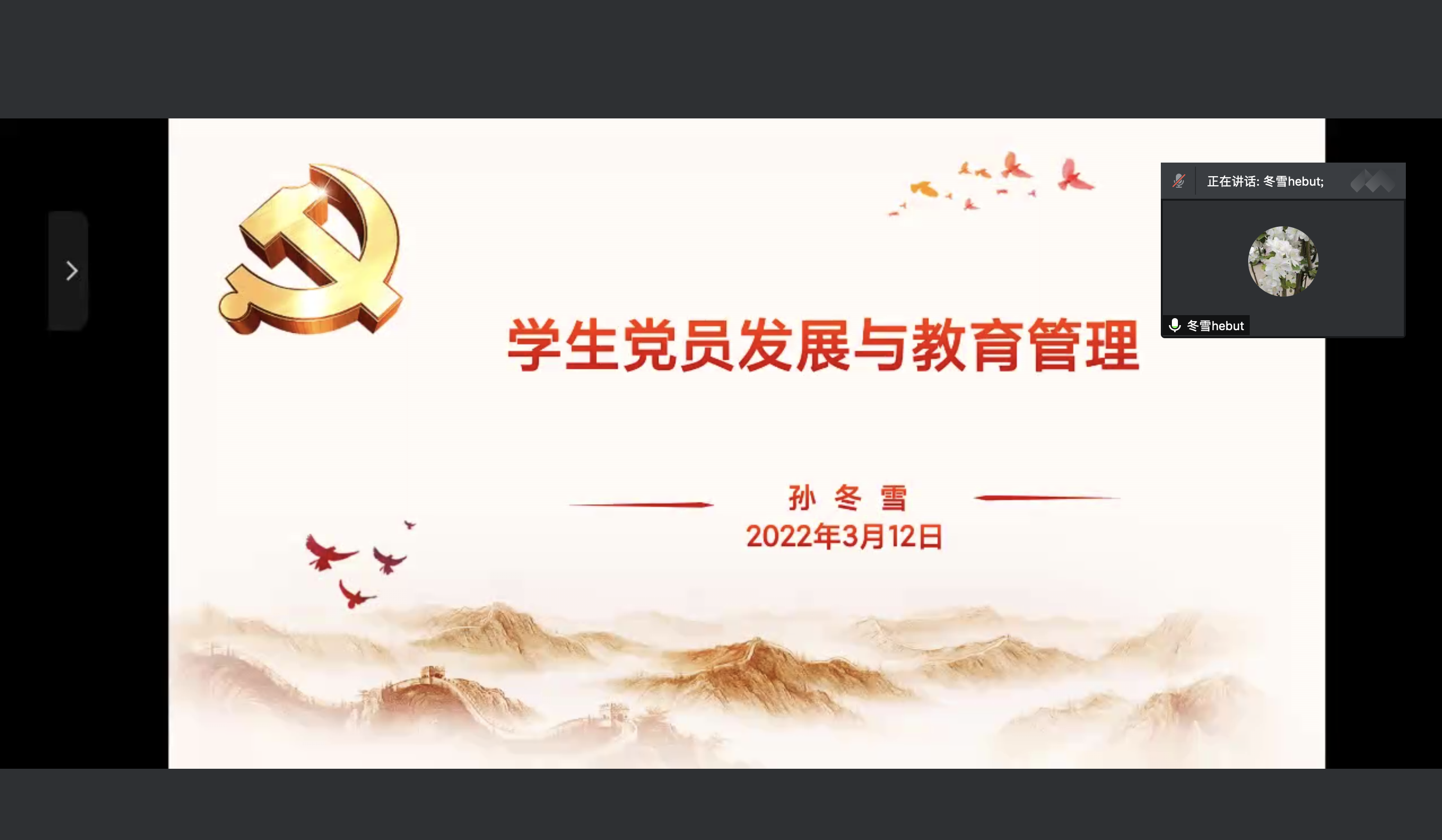 第三部分——学生党员教育管理。孙老师谈到党内组织生活和日常管理,党内组织生活包括三会一课、主题党日、组织生活会、民主评议党员和谈心谈话。