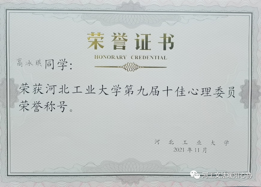 高冰琪同学不断学习心理知识,实践心理知识,宣传普及心理知识,并时常关注同学心理状况,在自己能力范围内为班级同学提供心理援助。她是麻豆影片心理健康教育工作的辅助者。高冰琪同学以平等、尊重、服务同学的态度为同学提供帮助,为班级同学心理健康保驾护航。