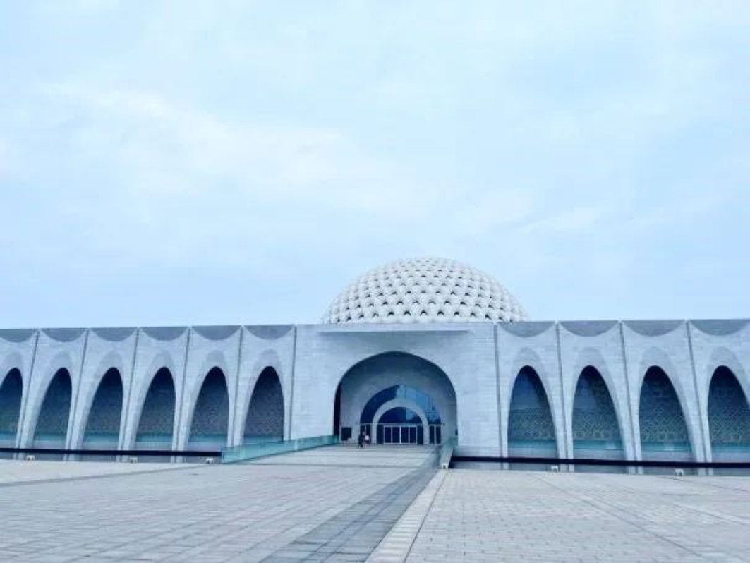 “小雨静楼台,微风动兰麝”,踏着雨声,实践团队前往了大厂民族宫。大厂民族宫地处大厂新城核心区中轴线上,北接公园,南邻中学,为整个新城核心区承前启后的重要节点。建筑设计采用“天圆地方”的形态,表达出中国传统哲学思想,并以传统的清真寺为原型,建筑外形方正稳重,中间的圆形主体高耸入天,建筑基座四周环绕的拱券从下到上形成优雅的弧线,这些花瓣式门洞,寓意着56个民族团结繁荣。