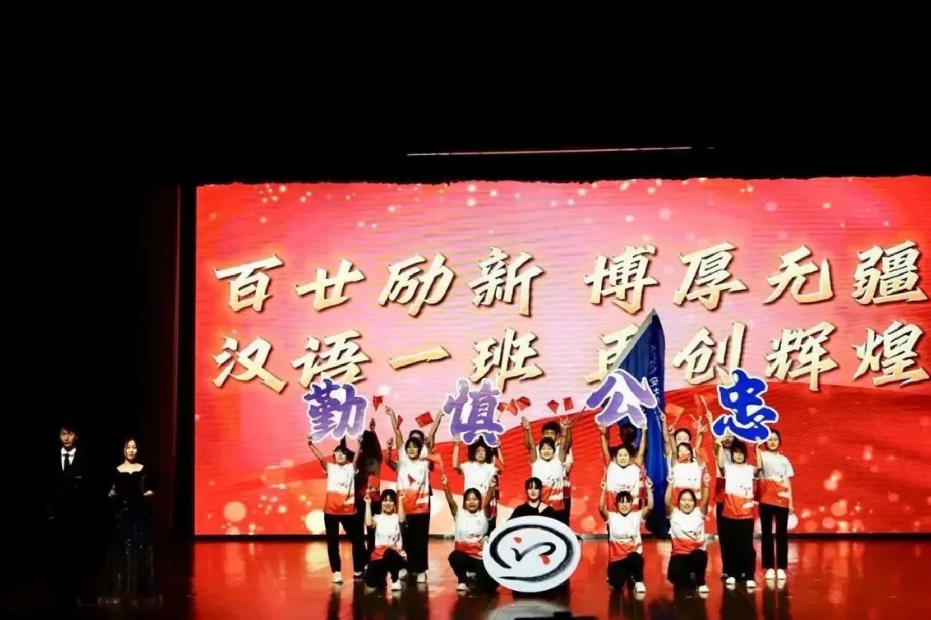 展示伊始,汉语201团支部先以一段充满活力又不失庄严的视频向大家展现他们对“勤”、“慎”、“公”、“忠”的积极实践:学习互助小组及优异成绩充分展现勤劳之风;“三制三法”团支部管理体系和良好班风昭示慎思之力;组成社会实践志愿小队投身实践服务是他们公以为民的生动体现;青年大学习百分百的完成率和积极开展以爱党爱国为纲的教育活动是他们对忠以报国的完美诠释。汉语201团支部还积极传播优秀文化,发扬支教精神,发挥专业优势,推动汉语走进世界,积极践行“汇聚四海情,共习华夏音”。