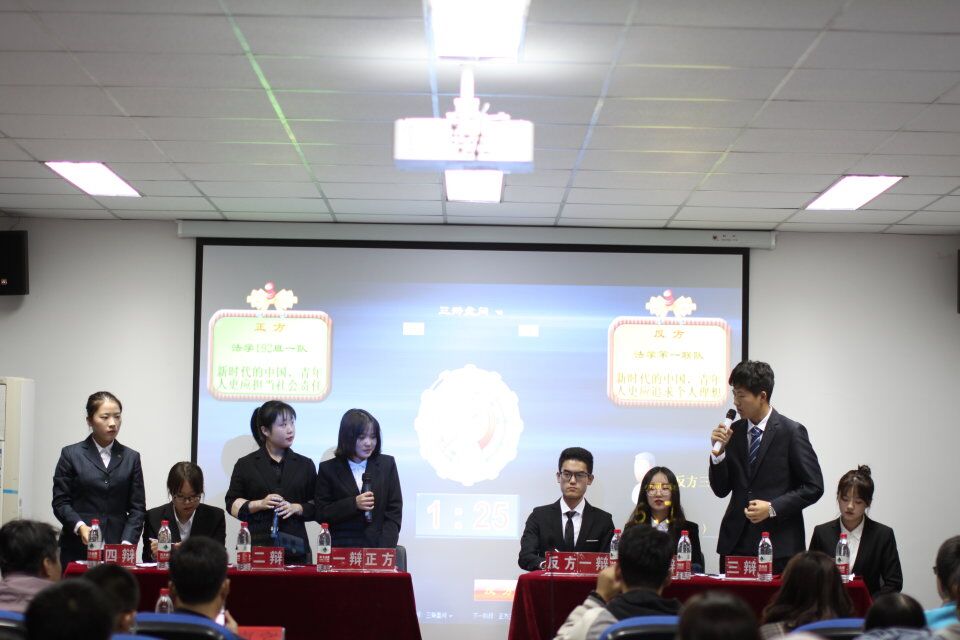 接着,正方三辩向反方质询:当今社会并非尽善尽美,青年需要用社会责任进行思想改造。反方则从概念区分上化解攻击。双方针锋相对,言辞激烈。四辩总结阶段,辩手们精神饱满,思维缜密,再次把比赛推向高潮,引起阵阵掌声。
