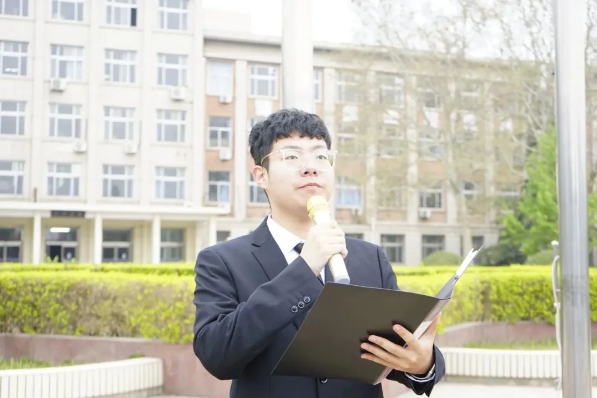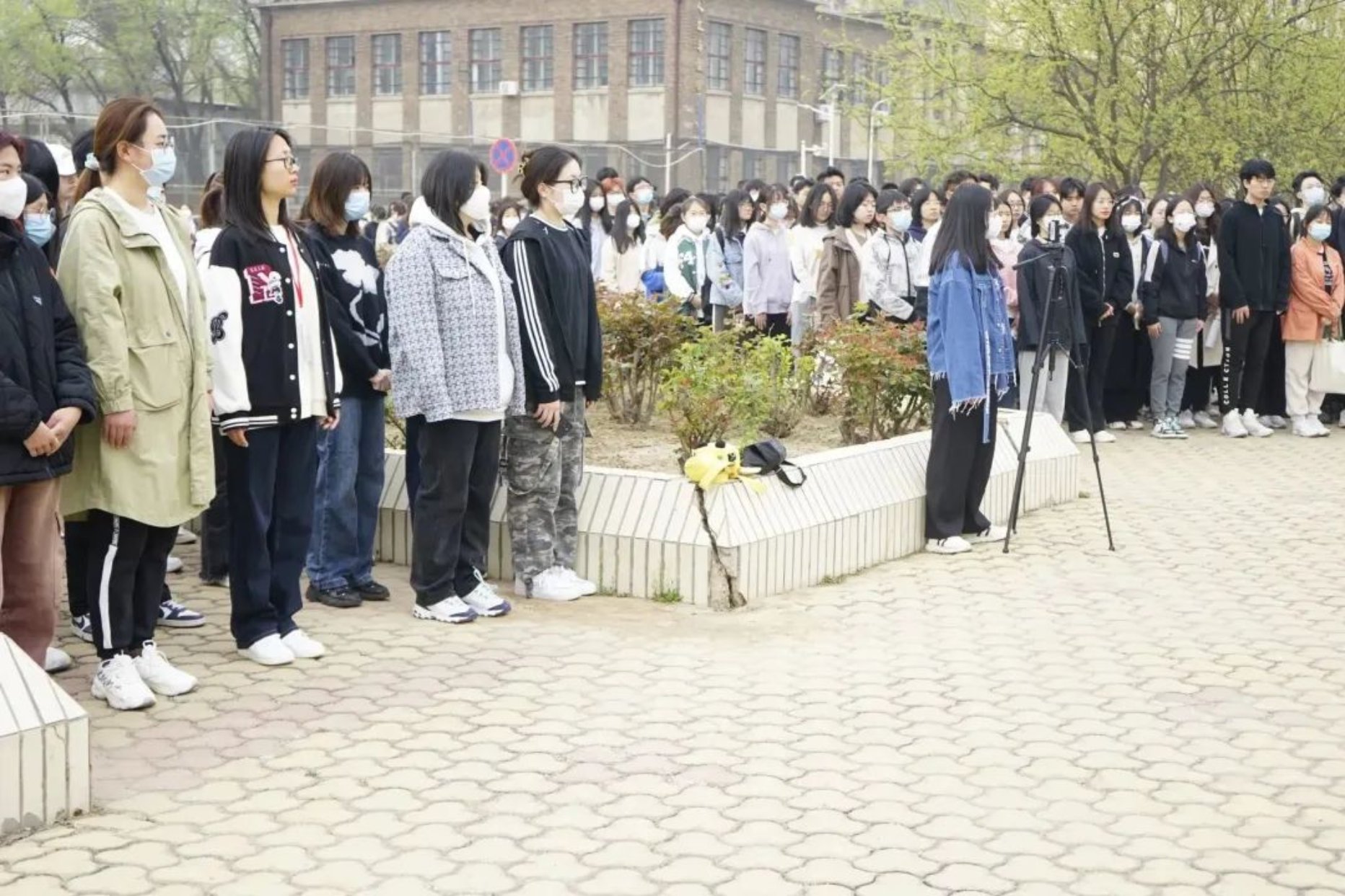 接下来学生代表公管222班姜一涵同学上台演讲。她首先回忆往昔,讲述在那个血雨腥风、金戈铁马的时代是革命先烈为民族独立和国家尊严而誓死抗敌献出了宝贵的生命;为彻底埋葬旧世界,建立社会主义新中国而前赴后继、英勇作战,抛头颅、洒热血。又是一年清明时,又到一年英雄祭。那一个个把生死置之度外的烈士,那些在战场上拼死杀敌的身影,岁月和人民没有忘记。