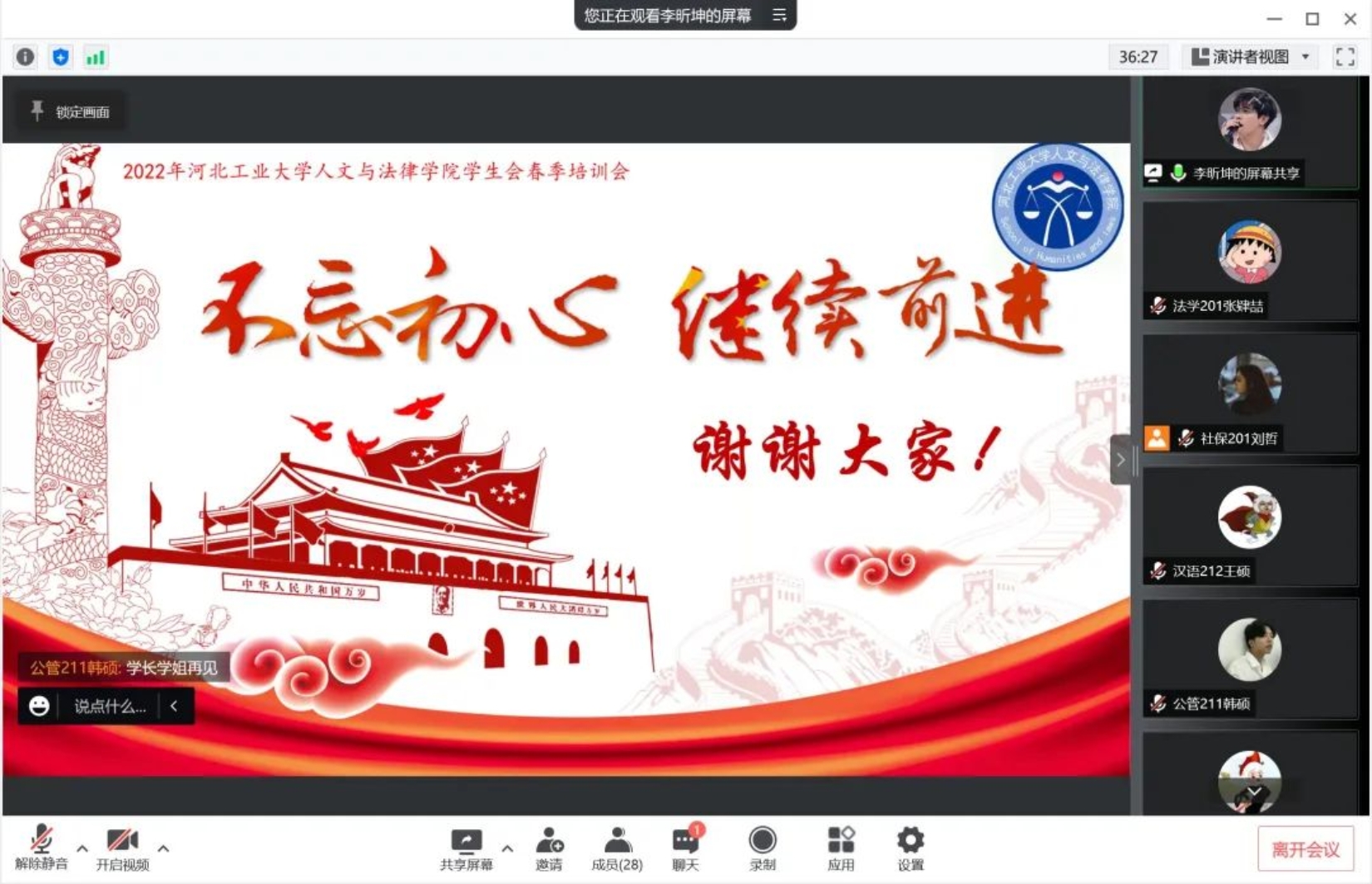 本次春季培训会就此落幕,我们将在今后的工作中践行本次会议精神。希望学生会全体成员都能够严格要求自己,共同建设一支让党放心、师生满意、社会认可、朝气蓬勃的学生队伍,也祝愿麻豆影片 学生会越来越好、日胜一日!