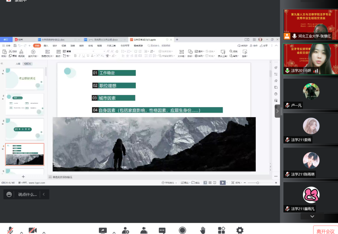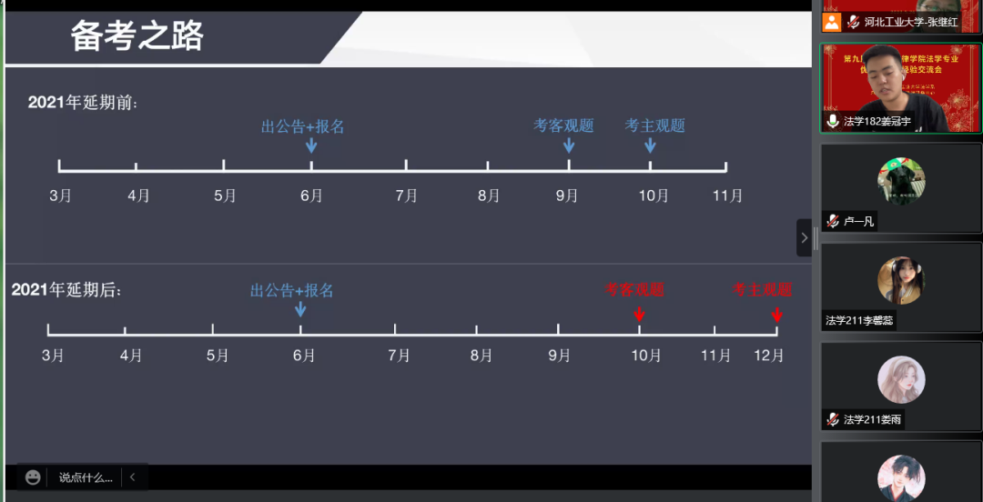 为了更好地帮助到学弟学妹们,参与交流的学长学姐们在百忙之中抽出空闲,为大家准备了一场丰富而又精彩的有关考研、保研、法考、出国和公考的经验分享会。