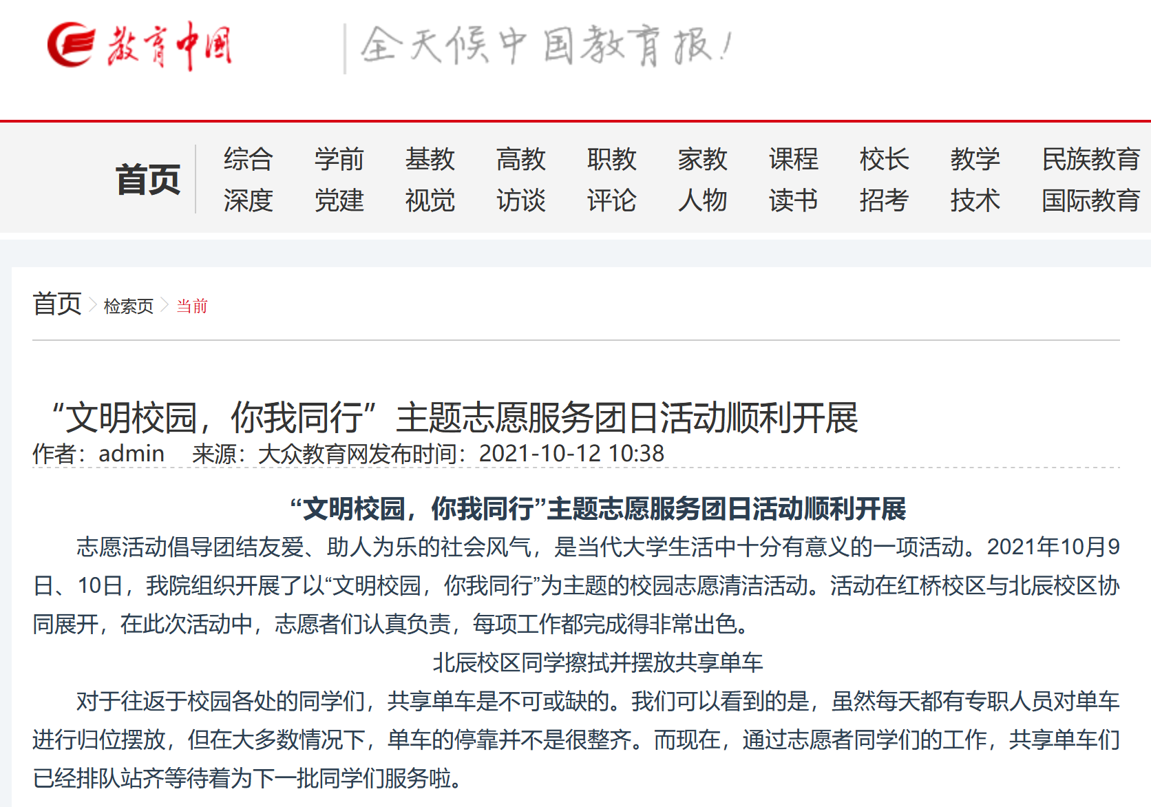 教育中国网发表《“文明校园,你我同行”主题志愿服务团日活动顺利开展》