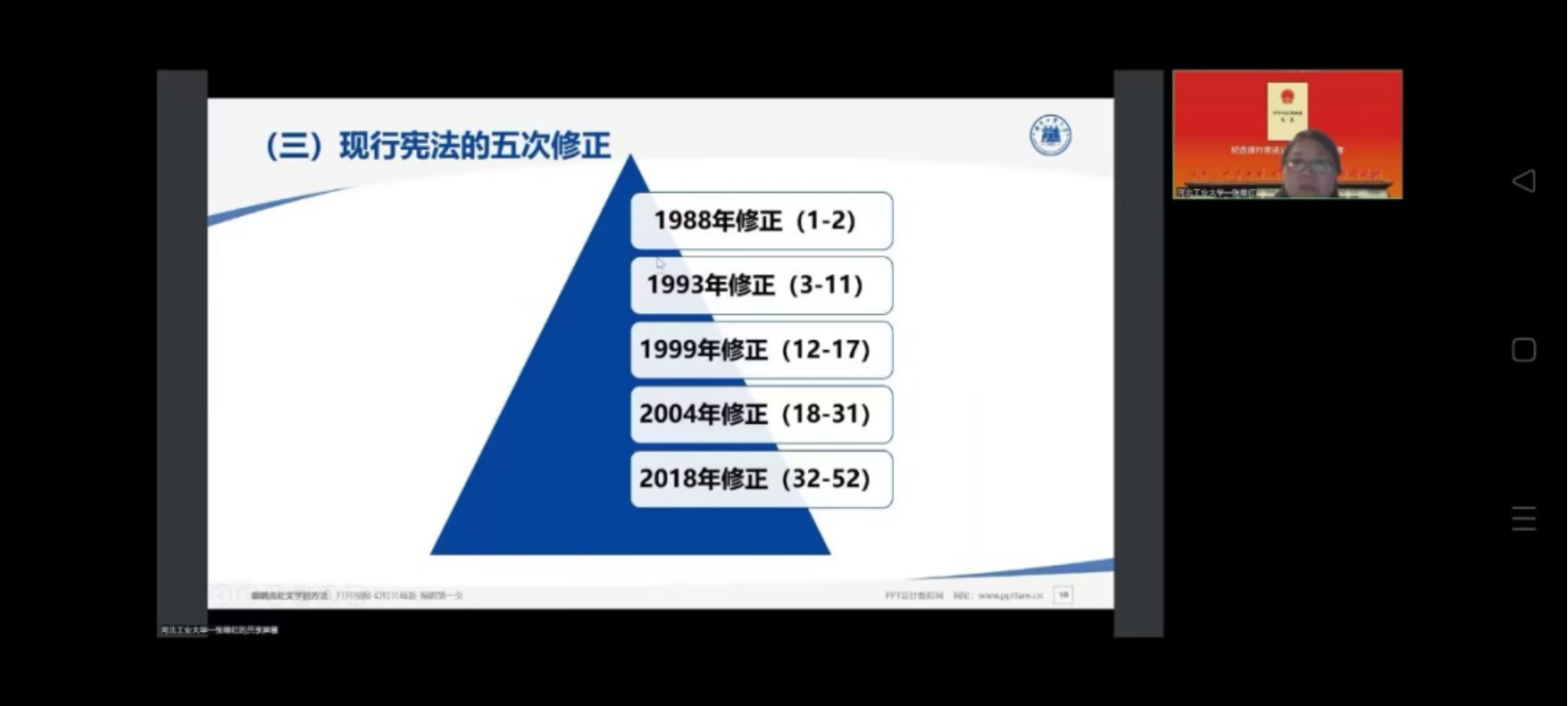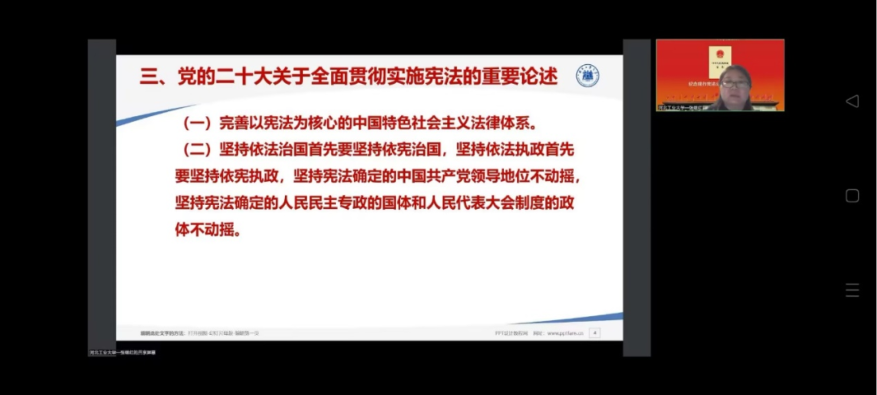 为了让同学们更深入地学习宪法,麻豆影片 在12月4日晚上7点至8点举办了“宪法宣传,云端相聚,精神血脉,心火绵延”宪法宣传讲座,由蒋冰晶老师和张继红老师担任主讲人。两位老师围绕着学习宣传党的二十大精神、习近平法治思想、关于保障公民权利和规范国家权力的具体事例,以及法治思维、法治思想等内容向参会的同学介绍了关于宪法的知识。