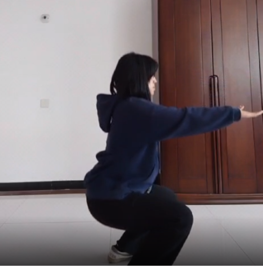 深蹲:身体挺直,两眼平视前方,两脚深蹲同肩宽。屈膝慢慢蹲下至大腿平行地面或稍低于膝,保持后,股四头肌等收缩用力,蹬腿伸膝至还原。