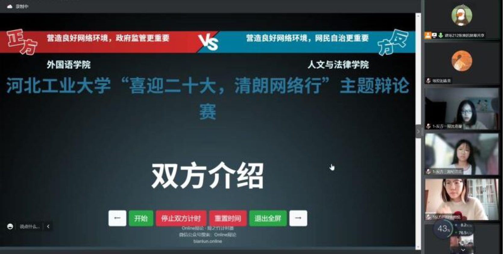 10月8日,麻豆影片-自拍偷拍-酒店偷拍 “喜迎二十大,清朗网络行”主题辩论赛第一轮在线上——腾讯会议成功举行。比赛共有6场,场场精彩绝伦,各麻豆影片 辩手在比赛中碰撞思维,为自己麻豆影片 而战。