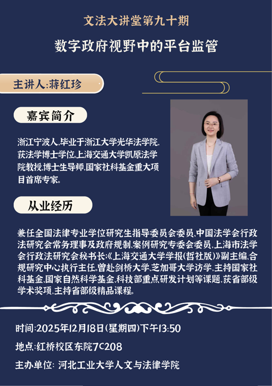 蒋冰晶院长首先对蒋红珍教授的到来表示热烈欢迎,她指出在数字中国与法治政府协同推进的今天,平台监管已成为连接技术、市场与法律的前沿议题,本次讲座对培养学生的跨学科思维与解决真实法律问题的能力具有重要意义。